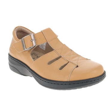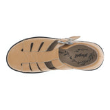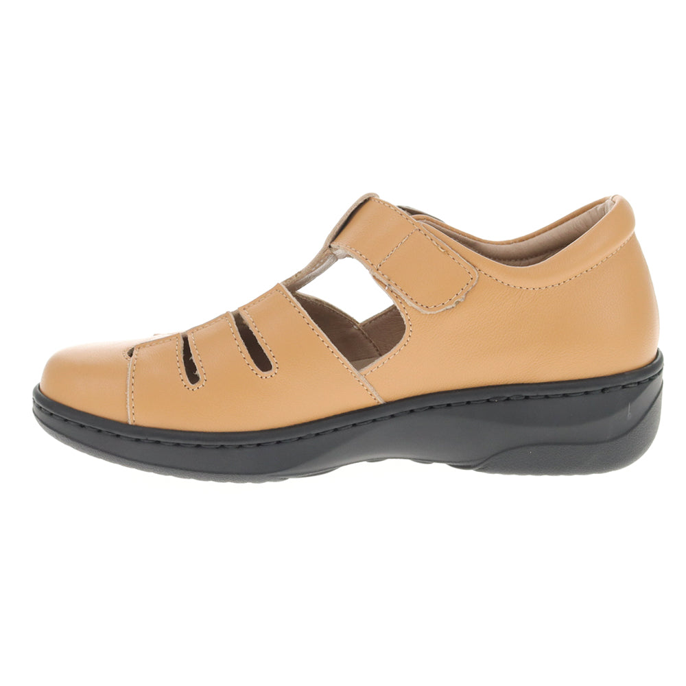 - Full coverage sandal with closed heel for stability